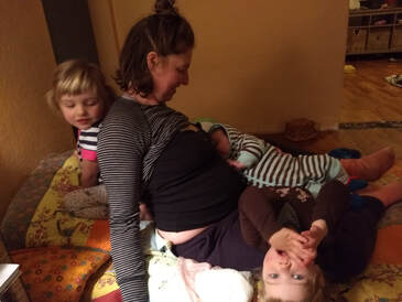 Once we were at home, I just gave up on plans. I wandered aimlessly around the house because (of course) the baby was sleeping peacefully once we got home. The girls stripped their clothes off and played some game which involved lots more screeching and throwing my therapy balls from the kitchen to the living room. At least they were occupied. At least they only woke the baby up a few times during this nap. At least I could maybe go to the store later… I checked Facebook more than I am proud of and did some online shopping. Online shopping for used items can sometimes give me a vague sense of purpose on days like this which feels strangely rewarding and vaguely unhealthy at the same time. Just now he went to sleep in the woven wrap on my chest. I thought I might walk to the store and get the things to make the couple of simple recipes I desperately want to concoct in my kitchen today. But I knew that didn’t feel like a good use of my time. I don’t want to spend this precious time in a crazed store around all of the thanksgiving shoppers. So I climbed into a bed covered in dirty spit-up rags, random things like baby nail clippers, breast pads, hemorrhoid cream, dirty clothes and clean clothes from me and baby…the sheets are semi-clean at least. I lay there a bit. I got the baby settled on the bed, out of the woven wrap (a small mercy because that doesn’t always stay asleep alone these days.) I thought about clipping his nails which are wicked-long. He scratches me on the chest when he gets upset. No, I decided I didn’t want to clip the nails right now, I feel like I “should” sleep. But I don’t want to. I am so tired that it will take me most of the last hour I have childcare to fall asleep and that doesn’t feel worth it. I want to stretch and also dump some of these wild thoughts out of my brain. I have too many thoughts today and many conflicting, confusing and unclear musings. I want to write this down. I get my computer and sit down on the floor to stretch while I type. So far it’s pretty satisfying. I am also drinking a small glass of wine which adds to my satisfaction. And I am still exhausted. Earlier today I considered if it would be possible for me to sleep less in order to have some time alone around my house—time to tidy things without distraction, or make something or just do things like this more regularly. Considering how to sleep less in the midst of this much exhaustion is kind of comical. Radical honesty: it is really difficult for me to admit that having 3 small children is hard. I am concerned that if I admit it’s hard people will say “I told you so. Having 3 is too many etc. etc.” And what if I ever wanted to have or to adopt more kids? Would people condemn me and say “You can’t have more. It was too hard for you.” It was hard enough going through a third pregnancy and having certain types of people greet me by saying things like “Oh, you are having ANOTHER??” or “You’re pregnant AGAIN?” or “Are you going to stop after this one?” No polite: “Congratulations!” or anything like that. Only judgement. But I don’t want those experiences and my fears to stop me from being honest. I want to be able to honestly share when the days are hard, when it’s hard to muster the compassion over and over and over again to be kind to the kids in the midst of a difficult day. I want to be able to relate that there are moments when I am overcome with rage on the inside, because this is a hard job and there are times I am at a loss for how to cope. I want to share that I think the overwhelm is normal, the rage is normal and the difficulty is 100% normal and even ok. I do know that all of this is only ok when I share it honestly and commiserate with other moms. This postpartum time has been better than the others partially because I am starting to know more and more how to do things one little step at a time and how to let things go. These are things I have learned in part from teaching Mamas how to slip little bits of selfceare into daily routines with kids. These little things help me float through it all, like today as I type this and straddle stretch on the floor. Like yesterday when I did lat stretches while my 2-year-old sat on the potty and chatted with me…and like last week when the only thing I did in one day that felt at all constructive for my well-being was to roll my foot out with a rubber ball for a mere 30 seconds before all hell broke loose once again. But I told myself that my 30 second sojourn into taking care of my body was enough, that it mattered and that I didn’t need to worry about doing more that day. And it did help, it was enough and some days are just like that.