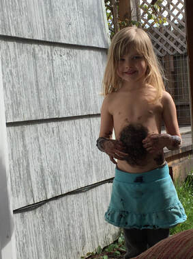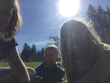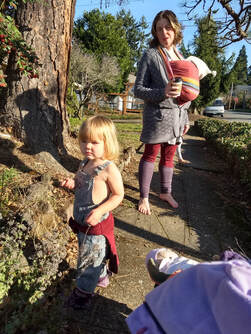 About 1/2 block after this second pit stop, the 3-year-old squatted down and I could tell that she was DONE. And I knew that I couldn’t carry her and that the last 4 blocks of the walk could be treacherous. I tried to start a new story. She kept stopping to squat down. I doubled down on my intention to stay calm and connected rather than get frustrated. The very end of a walk seems to be when she often hits her edge, no matter how far we have gone and it’s when I have to dig deep for my creativity and compassion. I am often wanting to get home too (I have to pee, the baby needs to get changed or nursed…whatever it is). One of the things I am working on is allowing space and time to stop and help them when they are struggling rather than following my agenda and trying to rush through it. I am very stubborn and often too attached to my agenda and as many of us parents can relate, rushing through difficult situations can produce very contrary results with toddlers. I stopped and I acknowledged that she seemed done, and that she was ready to stop walking. I told her that I wished I could carry her but that I could not because her brother was sleeping in the carrier and I also had our snack backpack. I told her that I was sorry I couldn’t carry her right now and that we could take another little rest but that we did need to keep going home. Acknowledging her difficulty seemed to help her and as we started up again I pulled her favorite story out of my pocket…the coast story about when we went to the coast for the day because Papa was removing the carpet. And I made it EXTRA long. I added more detail than ever and it bought us 2 WHOLE BLOCKS. Only 2 more to go! She started lagging again when the story was over and I tired pointing out some of the things we were seeing. After a bit of stop-start action, I found a puffy dandelion and gave it to her and told her she could make a wish. Watching a 3-year-old blowing on the flower with the indirectness of trying to get her breath just right, while she whispered a wish was precious. I saw her preciousness and that helped me. Shortly after that her 5-year-old sister said we should play “the bear game” and at first I was worried that such a game would scare the 3-year-old and asked what it was. It was a new game that the 5-year-old seemed to have crafted on the spot in which the 3-year-old was the bear and she was chasing us. Brilliant! It worked wonders for the last 1.5 blocks. 3-year-old would start chasing us and we would run away. We would then stop feigning relief only to have her start chasing us again. We were all engaged and laughing the rest of the way home. Within the last 1/2 block we passed a black-clad skateboarder we have seen around the neighborhood. I have never seen him smile yet as we passed him he grinned broadly and after he was most of the way up the block turned and shouted: “THAT WAS THE MOST JOYOUS THING I HAVE SEEN ALL DAY! THANK YOU!!! HAVE A BEAUTIFUL DAY.” We had managed a wonderful 3 hour and 15 minute walk together and we returned home happily exhausted and still connected. My heart felt very happy.